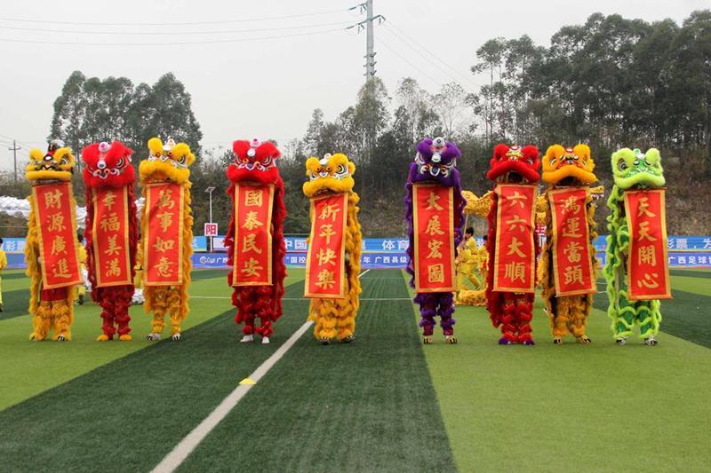 宾阳赛区赛前举行《龙腾狮跃绿茵风》表演。广西体育局供图